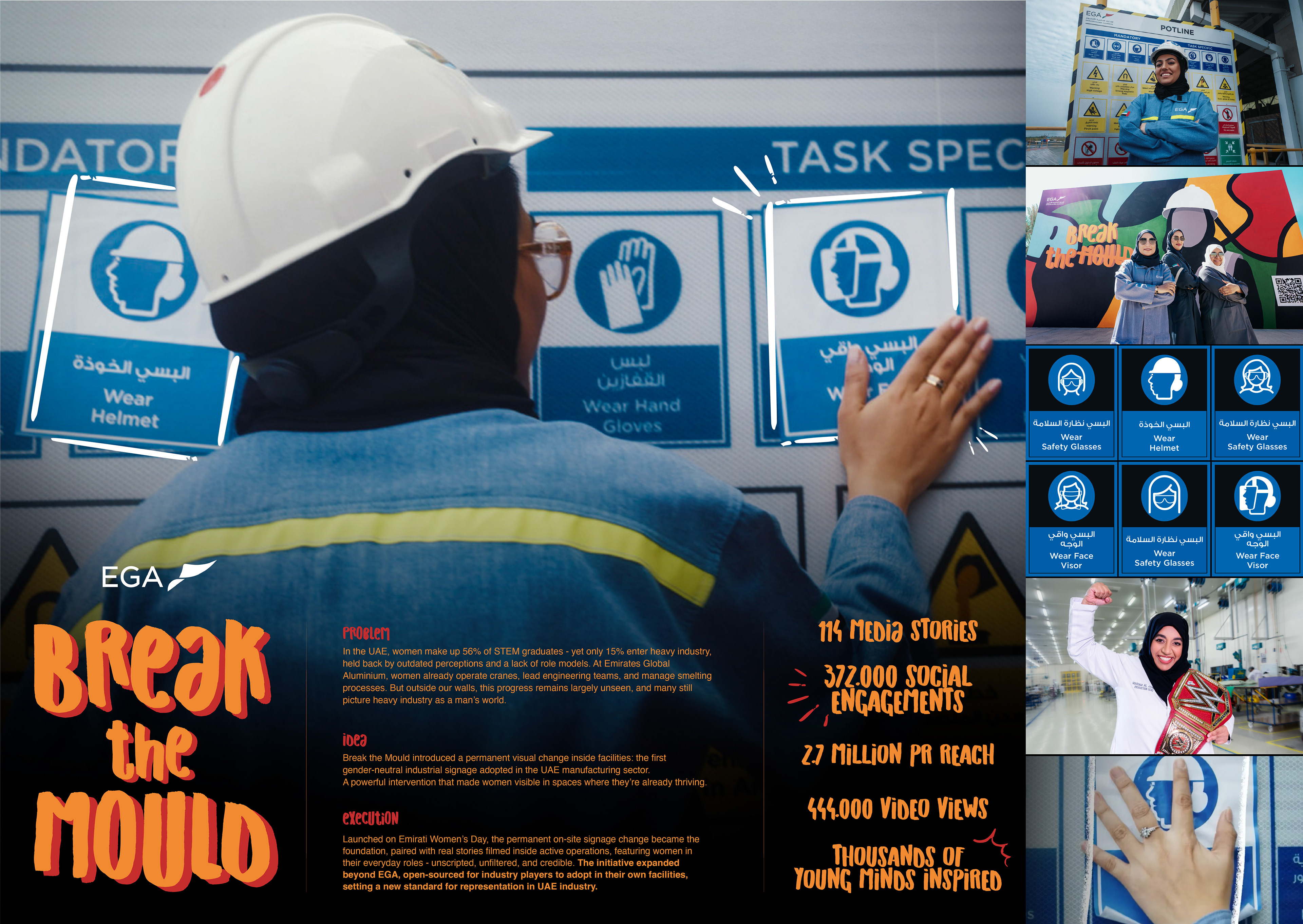 Our initiative, Break the Mould, set out to change these perceptions and inspire young women to consider careers in heavy industry- not just by inviting them in, but by actively showing them they belong. As part of this effort, EGA updated all their safety signs to be gender-inclusive, addressing both men and women in English and Arabic. We redesigned icons to represent women as well as men, making inclusivity visible at every level. To further demonstrate that women are not alone in this field, we highlighted the stories of pioneering women across the industry, the true heavy lifters from EGA, STRATA, AD Ports, and TAQA. These leading companies came together with a shared goal: to break stereotypes and open doors for the next generation. We also visited universities, spoke directly with students, and held workshops to explore career opportunities in heavy industry. To bring our campaign to life, we designed a mural that captured its spirit- an artwork that resonated with everyone involved.